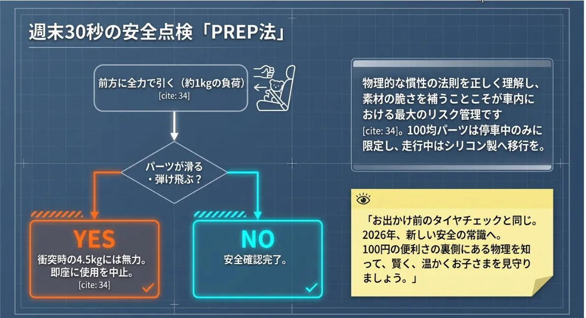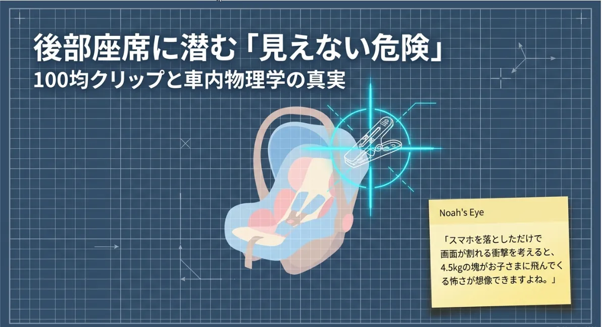 「チャイルドシートでおもちゃが落ちないように、100均のクリップで留めておこう」――。そんな何気ない工夫が、実は車内という特殊な環境下では思わぬリスクをはらんでいることをご存じでしょうか。福井で3人の子を育ててきた私(ノア)も、かつては100均の便利さに頼り切りでした。しかし、物理的な視点で車内の「慣性(G)」を計算してみると、私たちが良かれと思って使っているパーツが、非常時には全く別の顔を見せることがわかってきました。