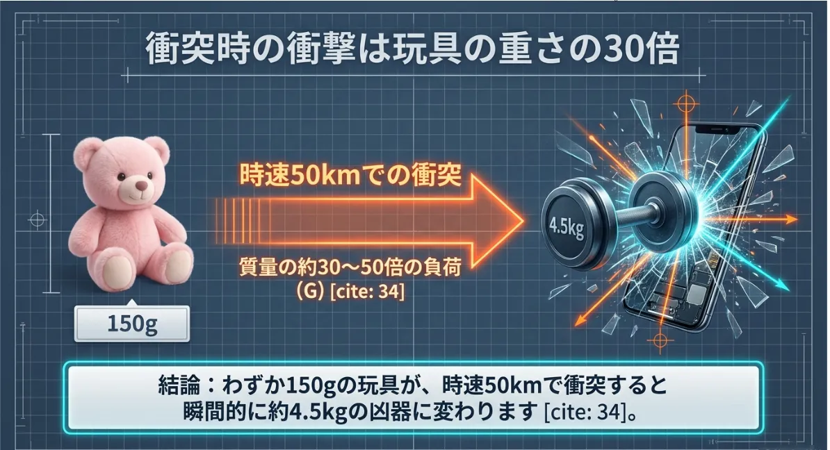自動車が衝突した瞬間、車内の物体には重力加速度(G)の約30倍から50倍の衝撃荷重が作用すると考えられています。例えば、わずか150g程度のプラスチック製おもちゃであっても、30Gの衝撃が加われば、その瞬間にかかる力は約44.1ニュートンに達します。