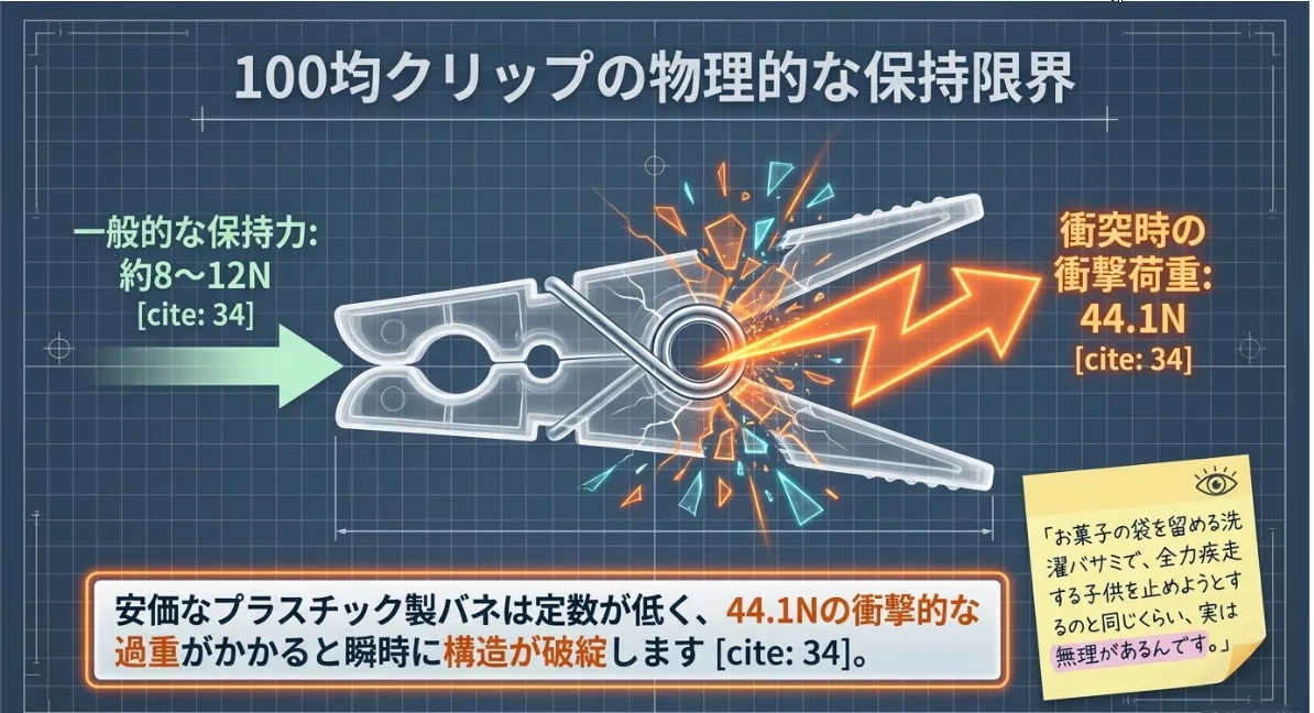 時速50kmでの衝突時、玩具には自重の約30倍の力がかかります。100均クリップのバネ強度では、この瞬発的な移動エネルギーを抑え込むことが物理的に困難です。