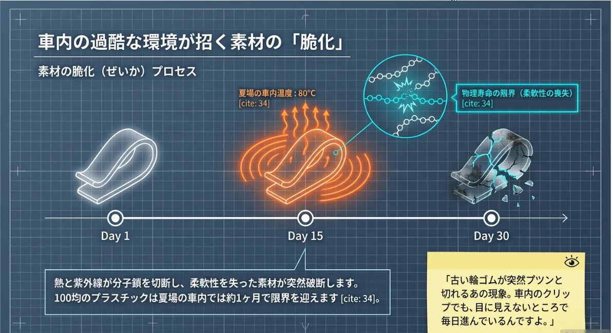 100均のクリップに多用されるポリプロピレン(PP)は、熱と太陽光に含まれる紫外線(UV)によって分子の結合が徐々に切断されていきます。これを「脆化(ぜいか)」と呼び、見た目は普通でも、素材の柔軟性が失われてガラスのように「もろく」なった状態です。走行中の微振動による「繰り返し応力」が加わり続けることで、ある日突然、何の前触れもなく破断するリスクがあります。
