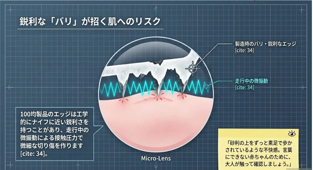 走行中の車内では、常に5Hzから100Hz程度の微振動が発生しています。チャイルドシートに座るお子さまの手元で、バリのあるパーツがこの振動によって肌にこすれ続けると、痛みを感じないほどの微細な切り傷(マイクロカット)が生じると考えられています。おもちゃを握った跡が赤くなっていたり、指先にチクチクした不快感を訴えたりする場合は、このエッジ形状が原因である可能性が高いと言えます。
