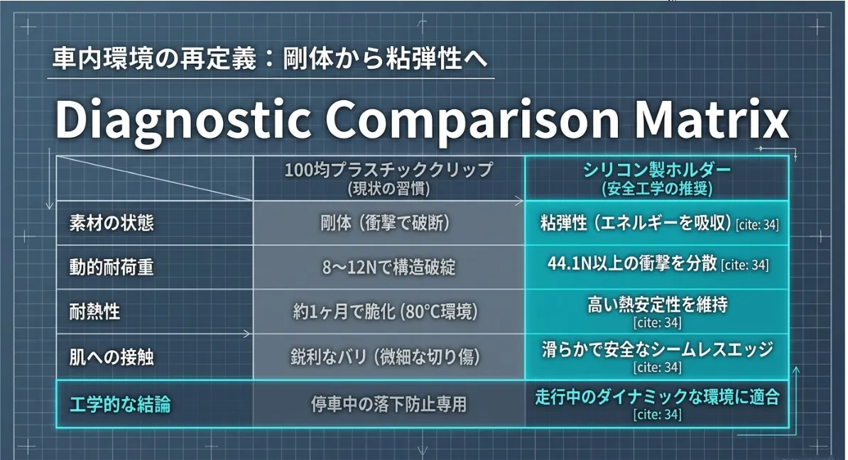 100均のプラスチックパーツが抱える「脆さ」と「保持力不足」を解決する工学的な答えが、シリコンエラストマーという素材です。なぜAmazon等で人気の「オーリンク」が車内安全に最適なのか、その物理的理由を紐解きます。