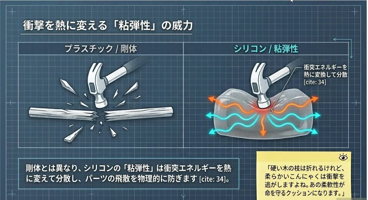 シリコン素材は、物理学でいう「粘弾性」という性質を持っています。これは、衝撃を受けたときにゴムのように伸びる「弾性」と、ハチミツのように抵抗する「粘性」の両方を兼ね備えている状態です。急ブレーキや衝突の衝撃荷重がかかった際、シリコンが伸びながらエネルギーを内部で「熱」に変えて吸収してくれるため、固定部分が弾け飛ぶのを防いでくれます。