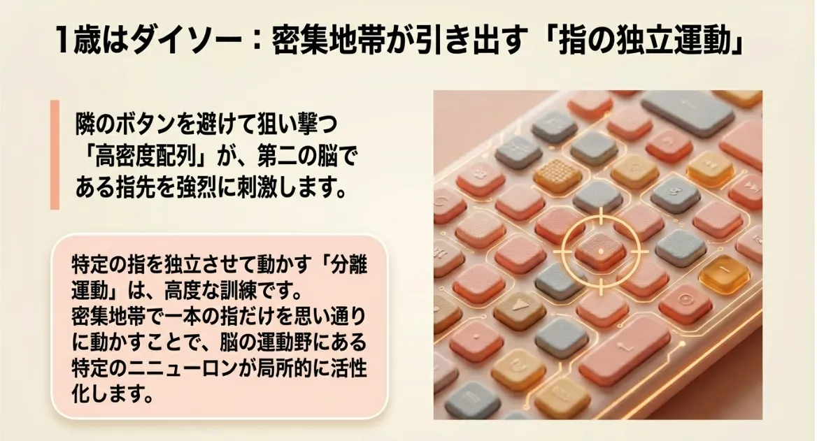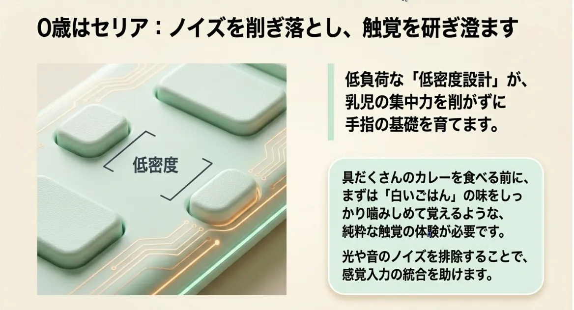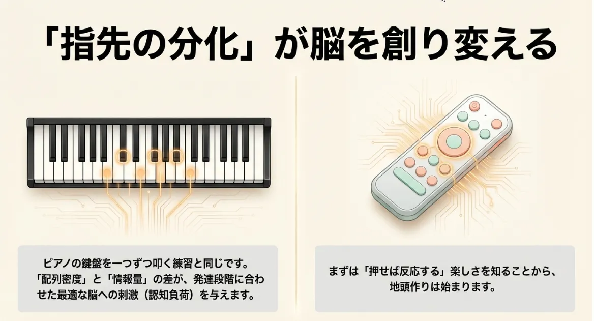 ボタンの「配列密度」や「情報量」という視点を持つだけで、それは子供の脳を育む立派な教育機器へと変わります 。