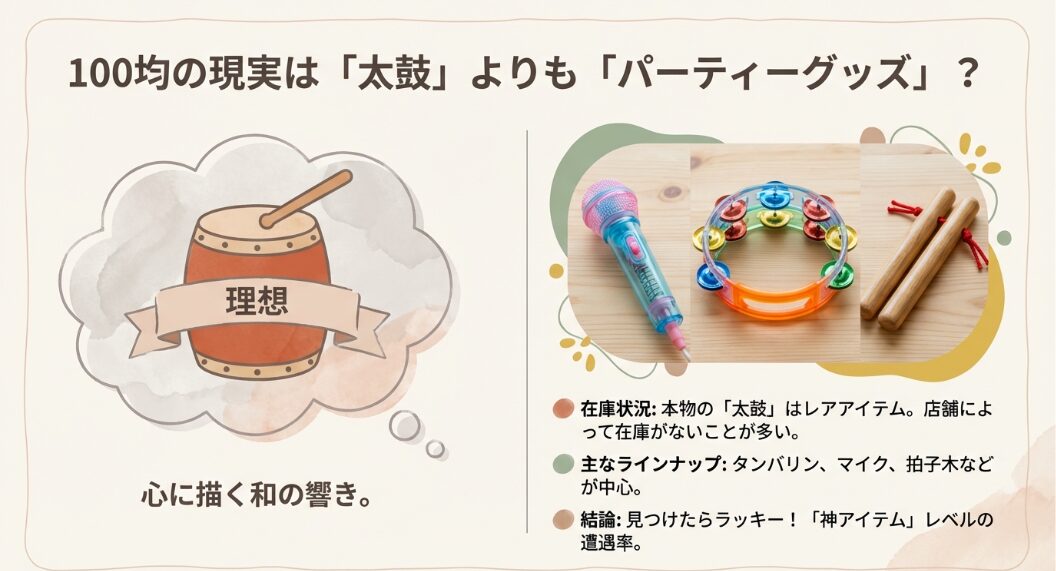 | ダイソー | タンバリン・マラカス等 | 玩具 / パーティー | 1歳〜 | ★★★☆☆(太鼓は激レア) |