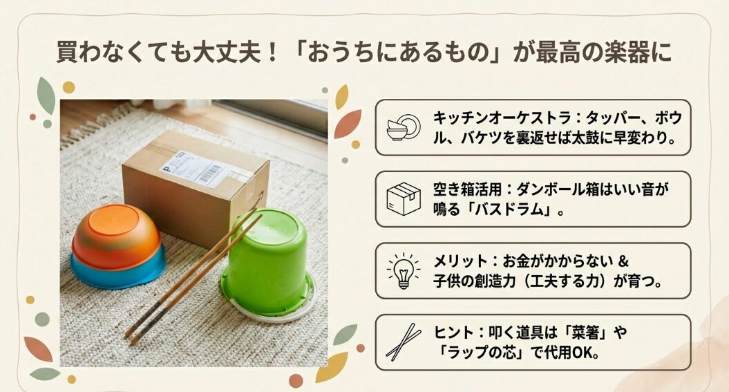 わが家の3兄妹が一番盛り上がるのは、実はおもちゃの太鼓ではなく、キッチンの「ザル」や「ボウル」を使った即席ライブなんです。