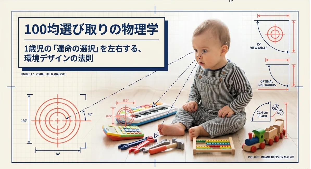 1歳児がアイテムを選ぶとき、それは「将来の自分」を考えて選んでいるわけではありません。目の前にある「物理的に最も目立ち、最も掴みやすい物体」に対して反射的に手が動きます。これを工学的には「不可避な接触」と呼びます。