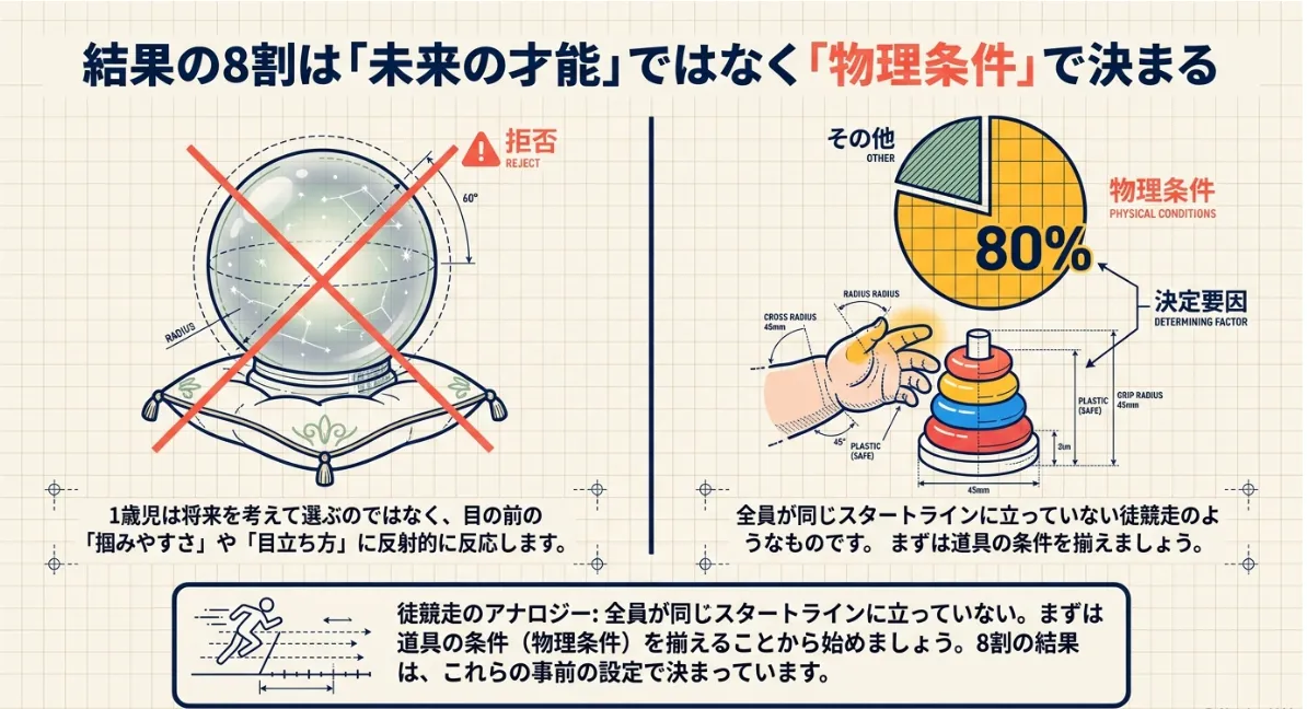 1歳児は「赤色」「光沢」「掴みやすい厚み」に吸い寄せられます。この条件を統一しなければ、統計的な選択ミスが起きてしまいます。