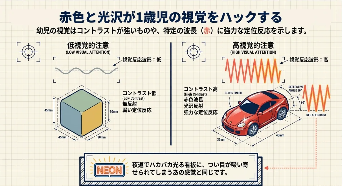 赤色と鏡面反射が1歳児の視線を物理的に固定する理由
