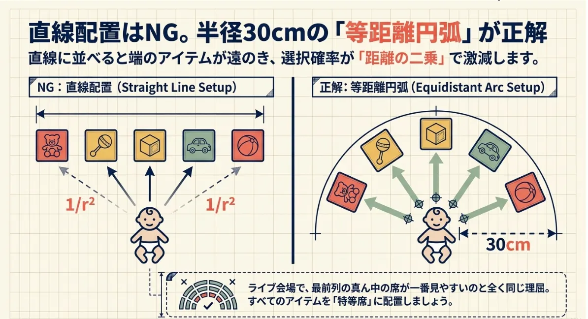 1歳児の有効なリーチ(手が届く範囲)は、肩を起点とした半径約25cm〜30cmの範囲に集中します。アイテムを直線状に並べると、中央のアイテムは近く、端のアイテムは遠くなります。物体との距離 $d$ が遠くなればなるほど、選択される確率は「距離の二乗」に反比例して急激に低下してしまいます。