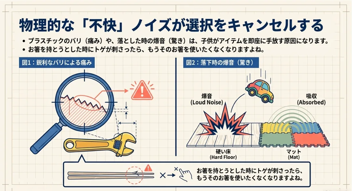 ダイソーの電卓や楽器などの硬質プラスチック製品は、フローリングに落とした際に「カシャン!」という鋭い高周波音を発します。この音に驚いて子供が泣き出してしまうケースは少なくありません。また、安価な成形品には「バリ(プラスチックの突起)」が残っていることがあり、敏感な1歳児の指先に侵害刺激(痛み)を与え、即座に手を離す原因(負の強化)になることも考えられます。
