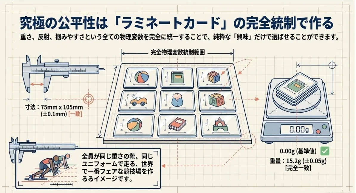 もし、現物のおもちゃによる物理バイアス(重量や厚みの差)をどうしても許容できない場合は、100均の「ラミネートフィルム」を使ったカード形式へのピボットが最も合理的な解決策です。全てのアイテムを同じサイズのカードにしてしまえば、反射率、重量、掴みやすさが完全に均一化され、子供の純粋な「視覚的興味」だけで占いを行うことが可能になります。