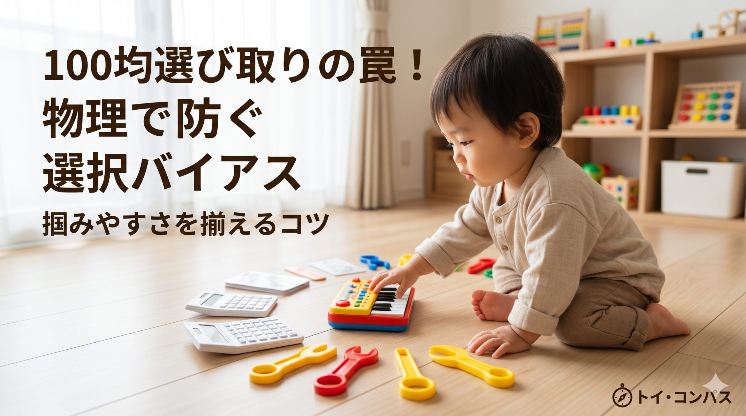 例えば、床にペタッと張り付いた薄いカードと、立体的なおもちゃのピアノが並んでいたら、どちらを選ぶかは明白ですよね。これは子供の意思ではなく、手指の構造上「ピアノしか掴めなかった」という結果に過ぎません。選び取りを正しく行うには、この「掴みやすさの差」というノイズを消し去る必要があります。