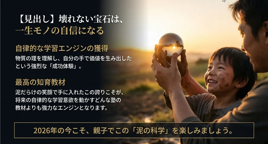 ドロドロの泥が、自分の手と物理の法則によってカチカチの宝石に変わる。この「自分の働きかけで世界が変わる」という実感は、子供に強烈な自信を与えます。この成功体験が、「難しい問題でも工夫すれば解けるはずだ」という粘り強い思考力(グリット)を育むきっかけになると言われています。
