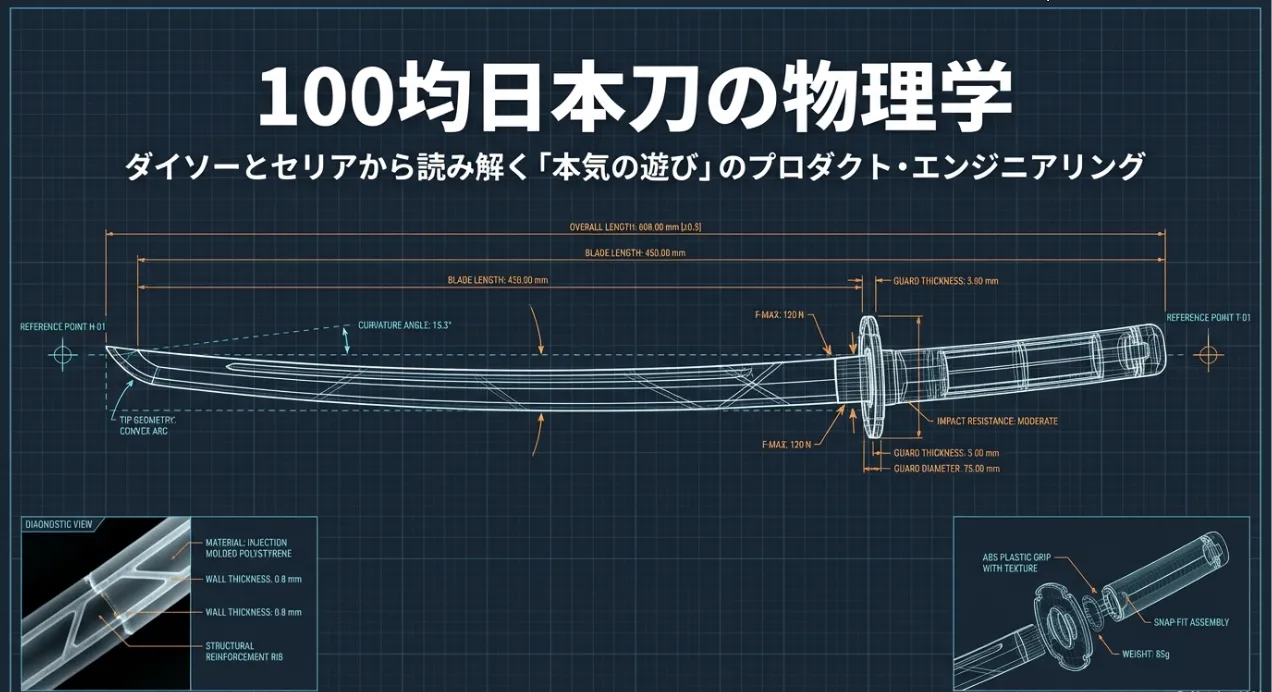 100円均一ショップの玩具コーナーで、子供たちが真っ先に手を伸ばす「日本刀」。ダイソーにもセリアにも並んでいますが、「どうせどれも同じプラスチックでしょ?」と思っていませんか?実は、2026年現在の100均刀は、工学的に見ると驚くほど設計思想が分かれているんです。