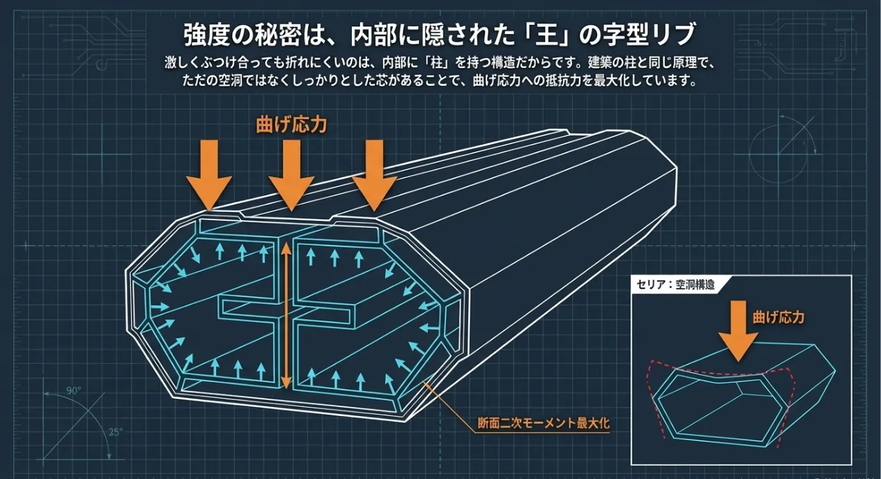 ダイソーの刀身は内部に「リブ」という柱が入っており、曲げに強い構造です。激しくぶつけ合っても折れにくく、長く遊びたい場合に最適。物理的な「断面二次モーメント」を高めた本格設計と言えます。
