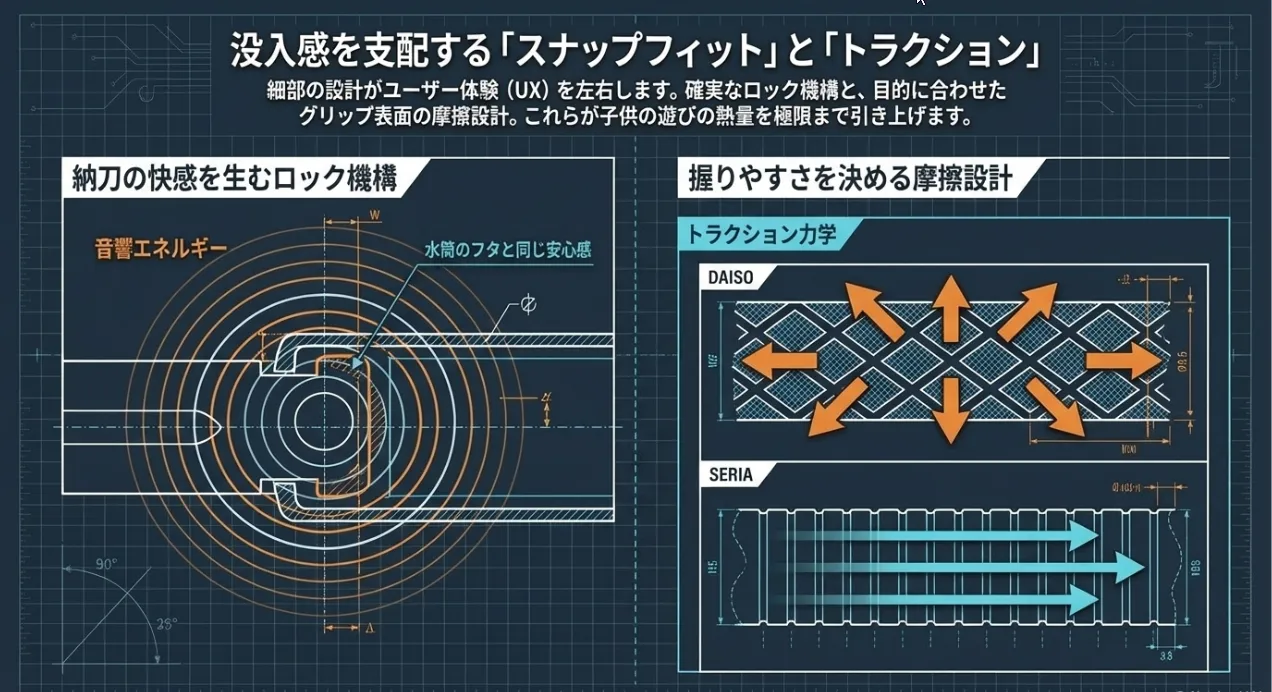 ダイソーの製品は、納刀の最後に「カチッ」という小気味良い音が鳴ります。これは、鞘の入り口付近にわずかな突起(アンダーカット)が設けられており、刀身の根元がそこを乗り越える際にプラスチックが弾性変形して元に戻る「スナップフィット」という機構を利用しているからです。