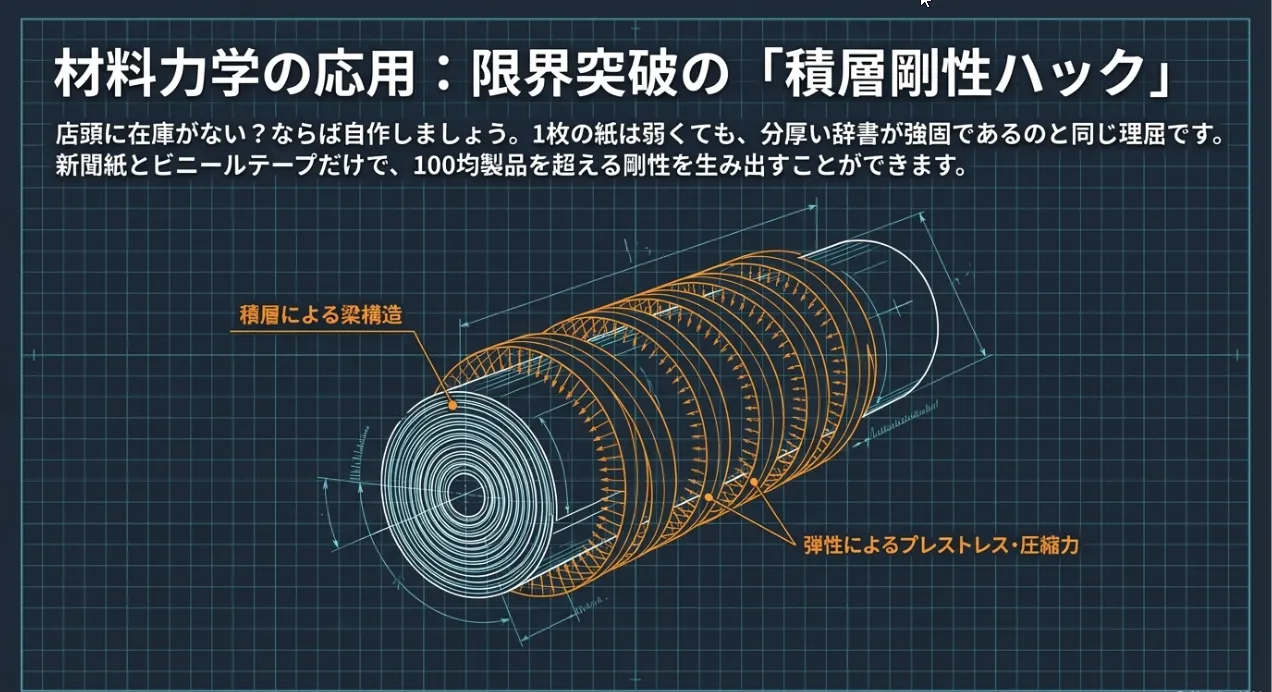 作り方のコツは、新聞紙を4〜6枚重ねて極限までタイトに巻き上げ、その上からビニールテープを「強く引っ張りながら」巻くこと。ビニールテープの弾性によって内部が常に圧縮される「プレストレス」状態になり、驚くほどの曲げ剛性が生まれます。100円のプラスチック刀が「中空」なのに対し、こちらは「密な積層構造」になるため、重みも実剣に近くなります。