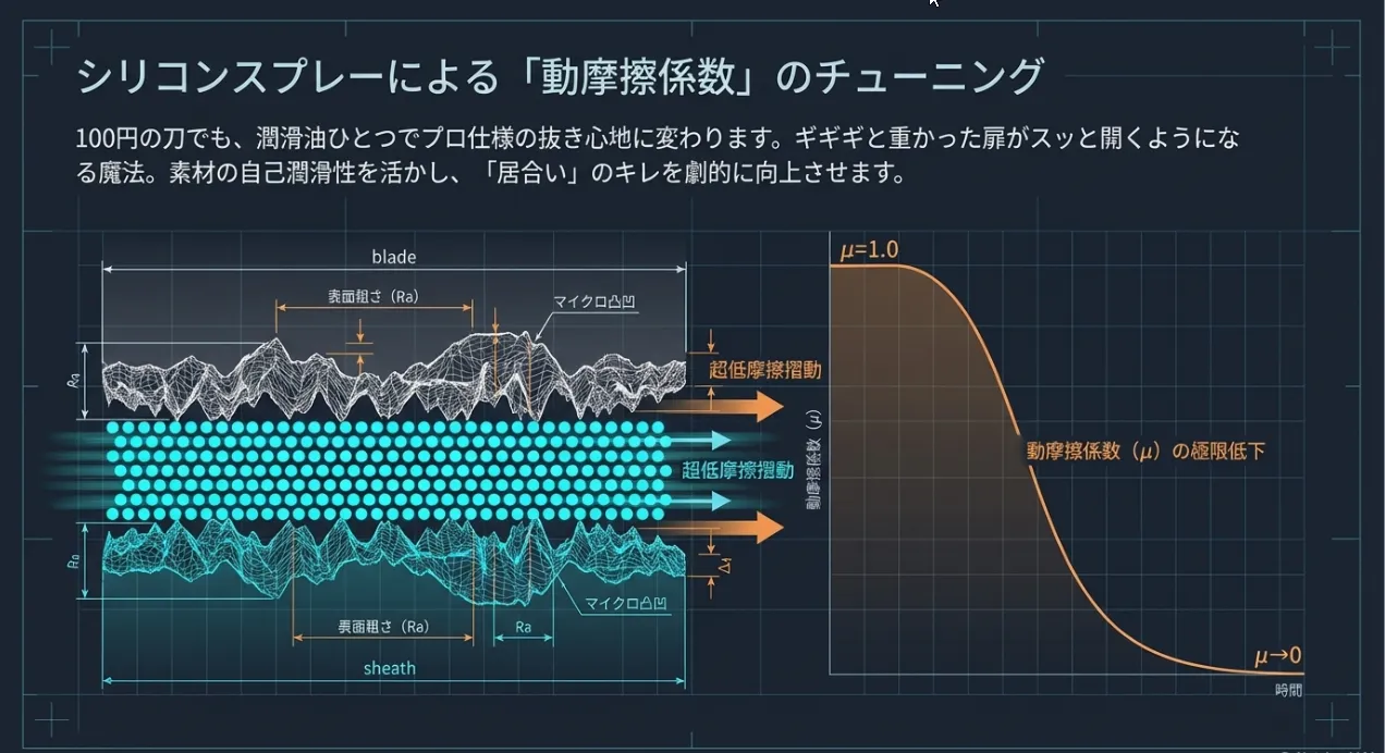 - 抜刀速度の向上:鞘の内側にシリコンスプレーを一吹きするだけで、自己潤滑性が高まり、摩擦抵抗が激減します。「固定はしっかり、抜く時は一瞬」という、理想的な抜刀フィールが完成します。