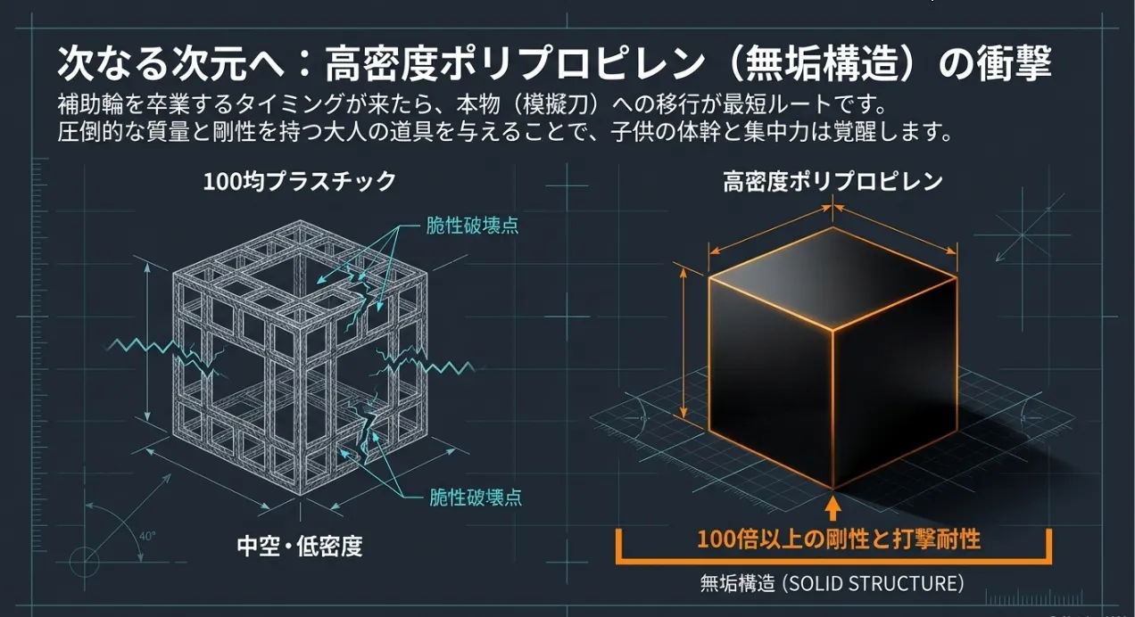 もしお子さんが「本気で素振りをしたい」と言い出したら、100均を卒業してコールドスチールのポリプロピレン製を選ぶのが正解です。木刀のようにささくれず、プラスチックなのに『重み』がある。この重さを制御しようとする動きが、体幹を育てる素晴らしい体験になりますよ。