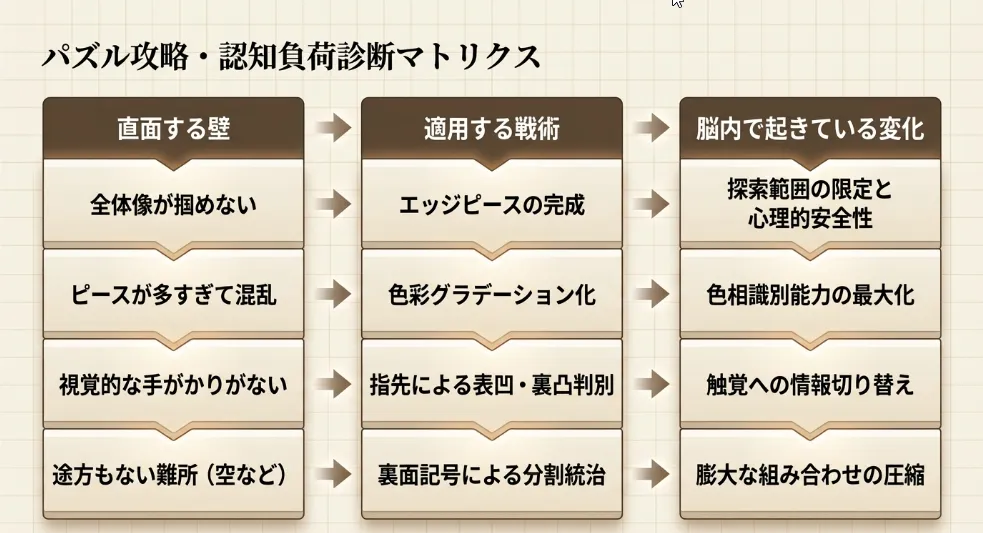 | 1. エッジ・ファースト | 直線の辺があるピースと、4つの角を特定する | 作業空間が定義され、心理的な安心感が生まれる |