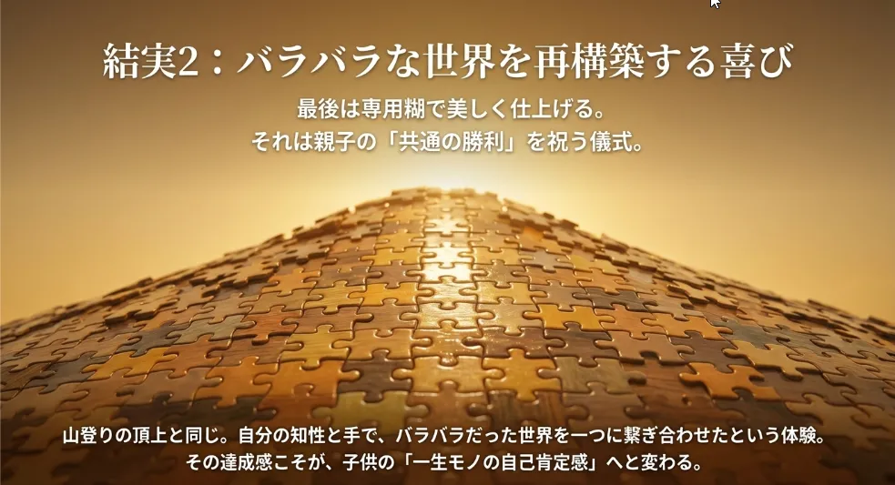 外枠から固める論理、色をグラデーションで捉える繊細さ、そして形状を読み解く空間認識。これらはすべて、大人になっても役立つ思考のツールです。 私の長男が福井の藤島高校に合格した際、最後まで机に向かい続けられた粘り強さの根っこには、幼い頃に家族で「カチッ」とはまる快感を共有したパズル体験があったと確信しています。