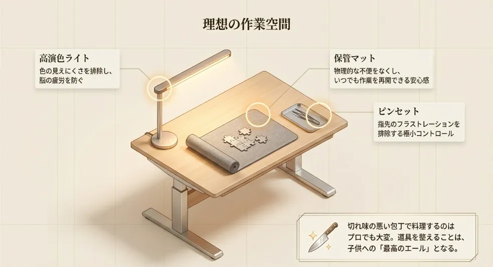 パズルを快適に進めるには、個人の技術だけでなく「環境」を整えるのが最大のコツです。 挫折の原因となる「見えにくい」「場所がない」「指が疲れる」といった物理的なストレスは、便利な道具で賢く解消しましょう。