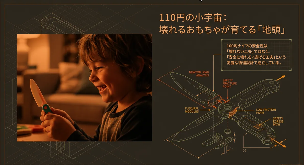 100均のナイフおもちゃ。それは単なる安価な玩具ではなく、限られたコストと材料の中で「いかに物理法則を味方につけるか」を追求した工学の結晶です。内部バネが4Nの力で逃げるのも、ABS樹脂が特定の角度で折れるのも、すべては計算された物理現象なんです。