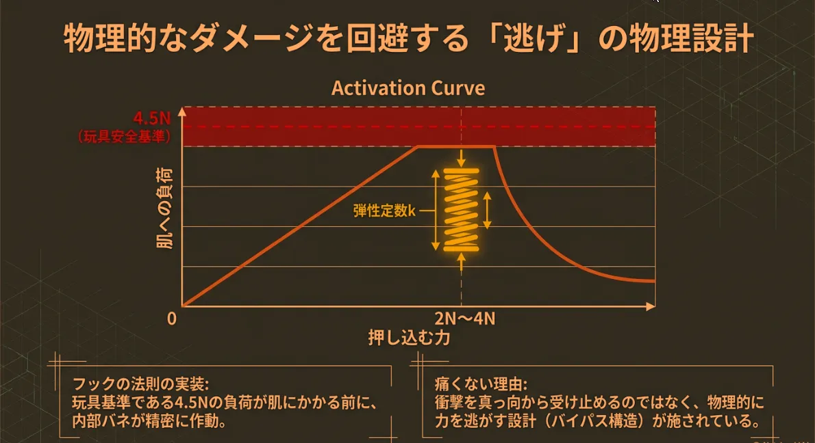 玩具の安全基準には、鋭利な先端が人体に食い込むのを防ぐための「4.5N(ニュートン)」という一つの基準値があります。100均のマジックナイフは、内部バネの「弾性定数(バネの硬さ)」を計算し、あえて2Nから4N(約200g〜400g重)という非常に弱い力で刃が引っ込むように設計されています。