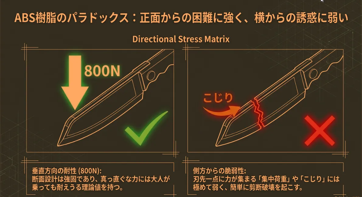 ABS樹脂刃の剪断破壊強度は理論上800Nと強力ですが、横からの力には極端に弱いです。「突き」には耐えても「こじり」で簡単に折れる特性を理解して遊ぶのがコツです。