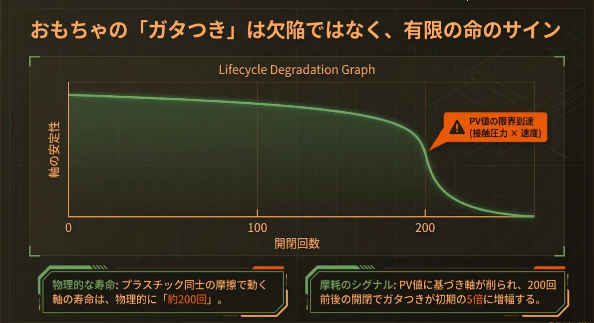 折りたたみ式のジョークグッズにおいて、最も早く限界が来るのが刃を支える「軸(ピボット)」の部分です。100均ナイフはコストの関係上、プラスチック同士が直接こすれ合う構造になっています。ここには、摩擦工学(トライボロジー)における宿命的な寿命が存在します。