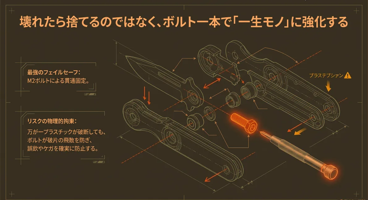 さらに、100均玩具に「フェイルセーフ(故障しても安全を保つ設計)」を取り入れるなら、市販のM2サイズのボルトとナットで軸を貫通固定してしまうのが最強です。万が一本体が割れても、破片が飛び散るのを物理的に食い止めることができます。110円の玩具に「1,000円クラスの剛性」を持たせる、大人の知恵の見せ所ですね。