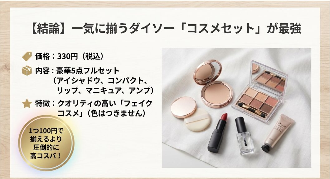 ダイソーが展開している「コスメセット」は、もはや100円ショップの域を完全に超えています。