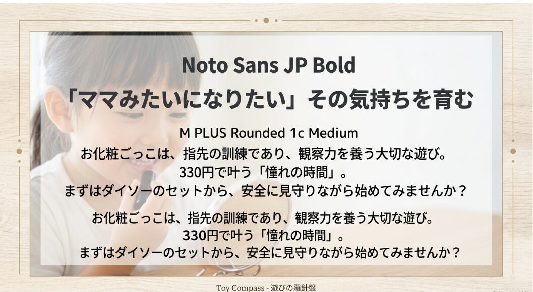 お化粧を通じて「きれいになる喜び」や「誰かをきれいにしてあげる優しさ」を育む時間は、どんな高価な知育玩具にも負けない価値があると感じています。