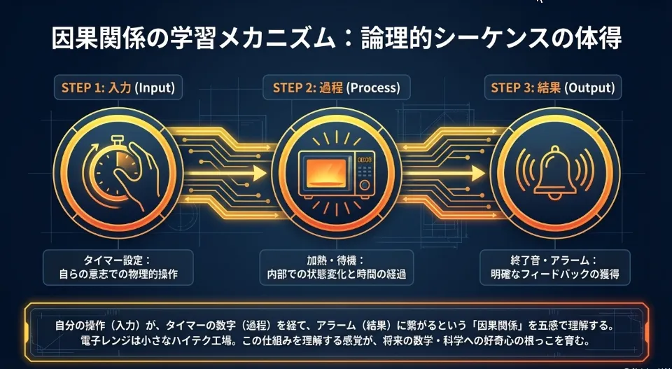 この自作レンジの最大の魅力は、本物の家電と同じ「調理の流れ(シーケンス)」を論理的に体験できる点にあります。単に音が出るだけの遊びとは、脳への刺激が全く違います。