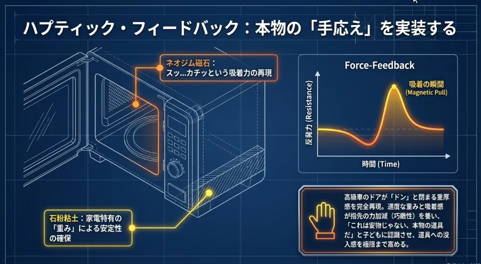 おすすめは、セリアなどで手に入る「超強力ネオジム磁石」を扉の縁に仕込むことです。扉を閉める瞬間に「スッ……カチッ」と吸い込まれるような手応えが生まれます。この精密な家電らしい挙動は、子供に「これは大切な道具だ」という心理的な安心感を与え、指先の力加減を微調整するトレーニングにもなります。また、本体の底にダイソーの「石粉粘土」を詰めてあえて重みを持たせるのもテクニックの一つです。扉を開けた時に本体がひっくり返らない「安定感」こそが、遊びの没入感を支えるのです。