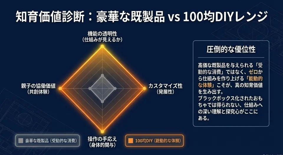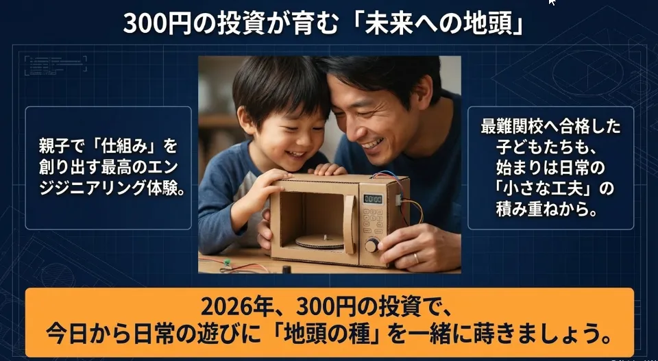 100均資材を組み合わせた「高機能・擬似電子レンジ」の構築は、単なる節約工作ではありません。それは、子供が「世界の仕組み(システム)」に触れ、自分の操作が環境に変化を与える楽しさを知るための、立派な知育プロジェクトです。