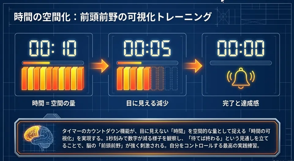 特に「待機」のステップが重要です。子供にとって、目に見えない「時間」をじっと待つのは難しいこと。でも、目の前で数字がカウントダウンされていく様子(時間の定量化)を見ることで、「あと少しで終わる」という見通しを立てる力が養われると言われています。
