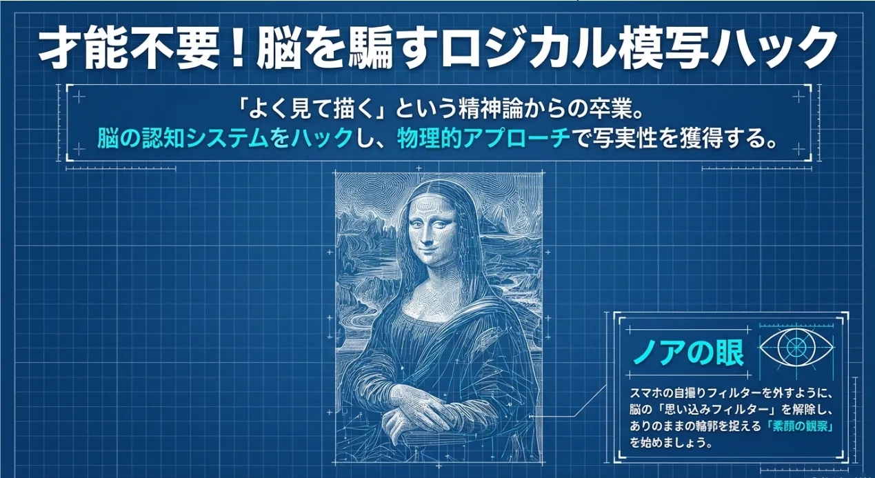 実は、中学生が写実的な絵を描けないのは「絵心がない」からではなく、脳が勝手に情報を省略して「記号」として処理してしまうからだという考え方があります。つまり、正しく描くためには「よく見て描く」という根性論ではなく、脳の思い込みをちょっとだけ騙してあげる「技術的なハック」が必要なんです。