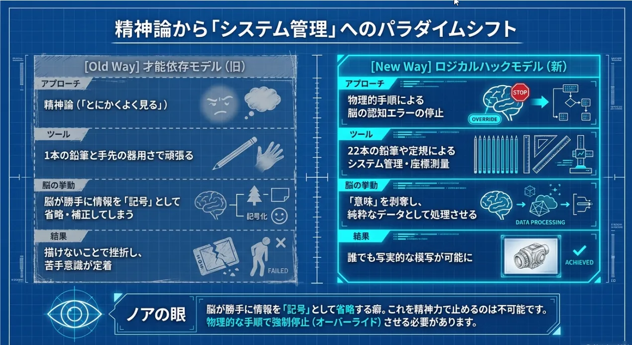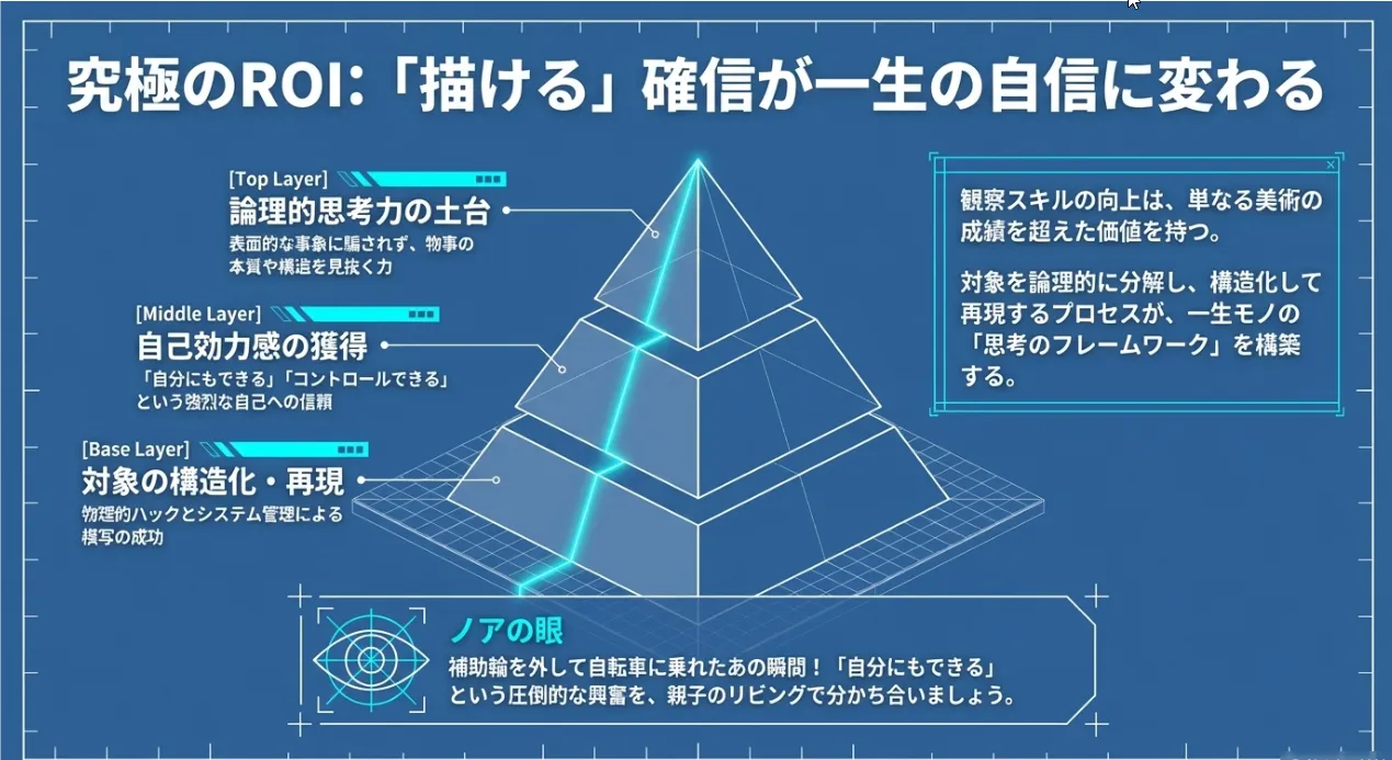 中学生にとって、模写を通じて「目に見える通りに再現できた」という体験は、単なる美術の成績以上の価値があります。自分の脳をハックし、道具をシステム化して、困難な対象を攻略していくプロセス。これは数学や理科の難問に立ち向かうときの「構造的思考」そのものだからです。