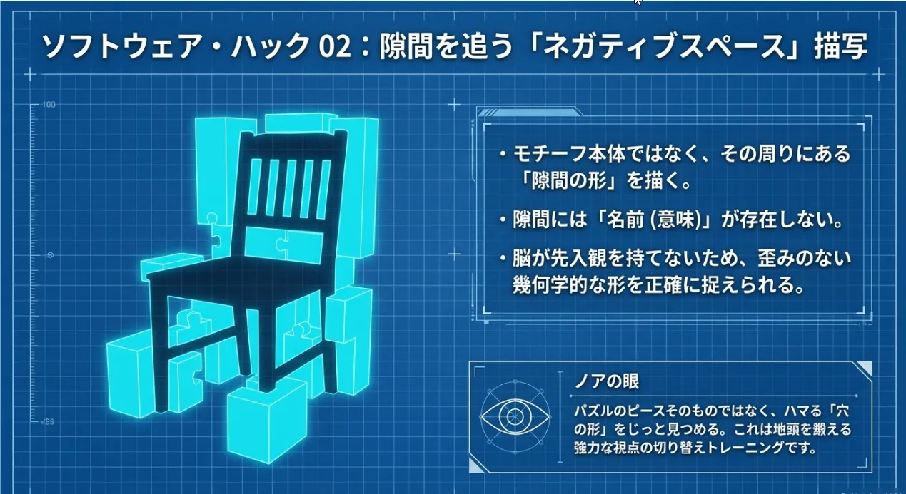 もう一つの強力なハックは、描きたいものそのものを見るのではなく、その「周りの隙間(ネガティブスペース)」に注目することです。例えば、椅子の脚を描くのではなく、脚と脚の間に見える「背景の形」をパズルを埋めるように描いていくのです。