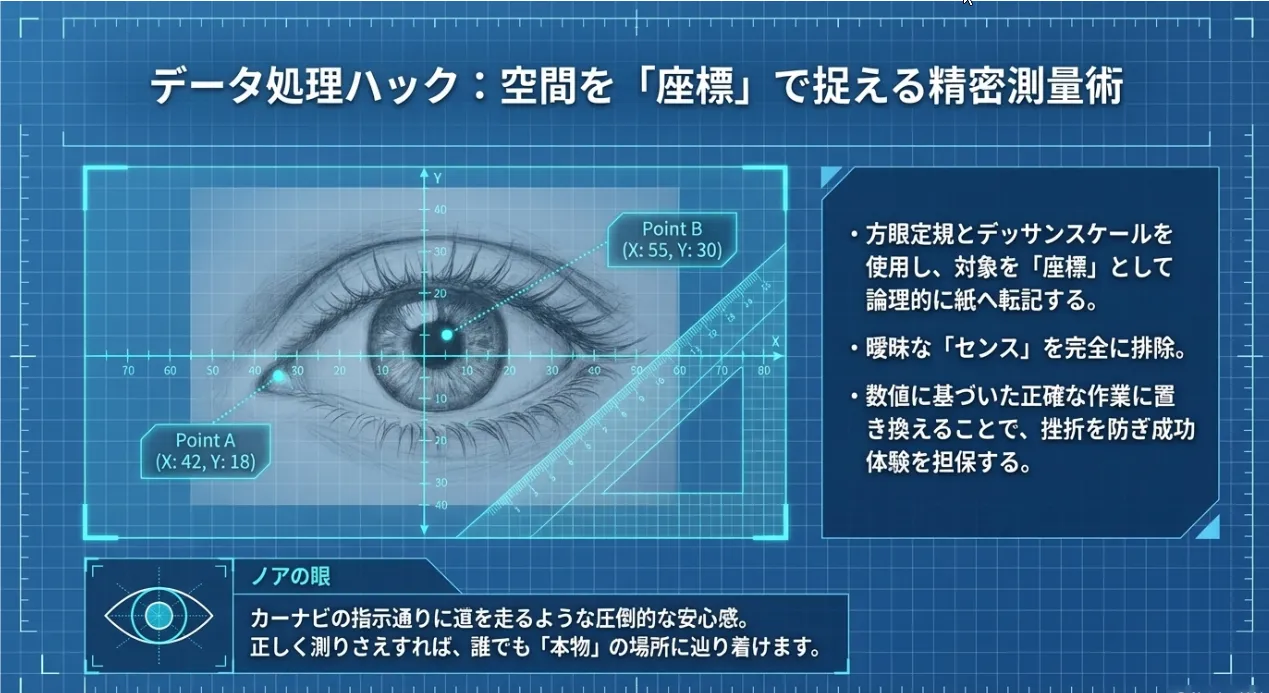 勘に頼らず、方眼定規やデッサンスケールを使って「座標」として形を転記します。アートを「正確な作業」に置き換えることで、失敗する恐怖を取り除き、成功体験を積み上げます。
