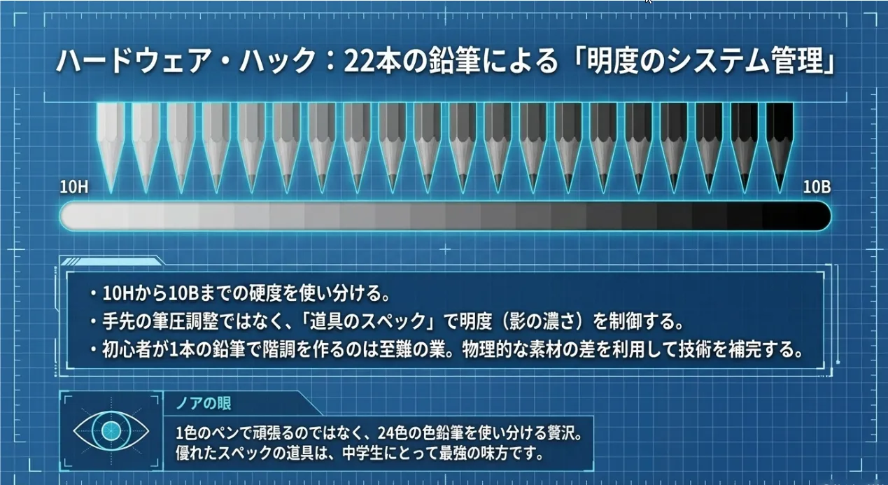 多くの初心者はHBや2Bの鉛筆1本で全てを描こうとしますが、これでは画面が鈍く濁ってしまいます。写実的な絵を最短で描くコツは、物理的な鉛筆の硬度差を「明度の数値」として割り当てることです。例えば、一番明るい場所は4H、中間の影はB、一番深い闇は6Bといった具合に、持ち替える「動作」を「色の切り替え」として自動化してしまいましょう。