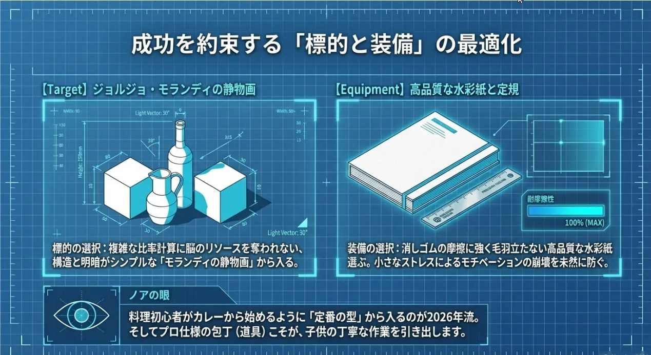 私も昔、難しい風景画に挑んで挫折した経験があります。でも、モランディのような「シンプルな形の重なり」から入ると、パズルを解くような感覚で没頭できるんですよね。この「これならできる!」という確信こそが、子供の自律的な学びのガソリンになるんです。