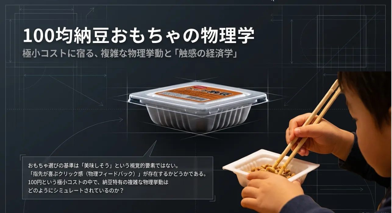 100均の納豆おもちゃを「単なるままごと道具」と片付けるのは勿体ないことです。セリアのパックに見られる0.1mm単位の公差設定や、楕円体パーツが生む不規則なトルク変化、そしてDIYで再現できる繊維の粘弾性。そこには、私たちの指先を満足させるための緻密な物理法則が息づいています。