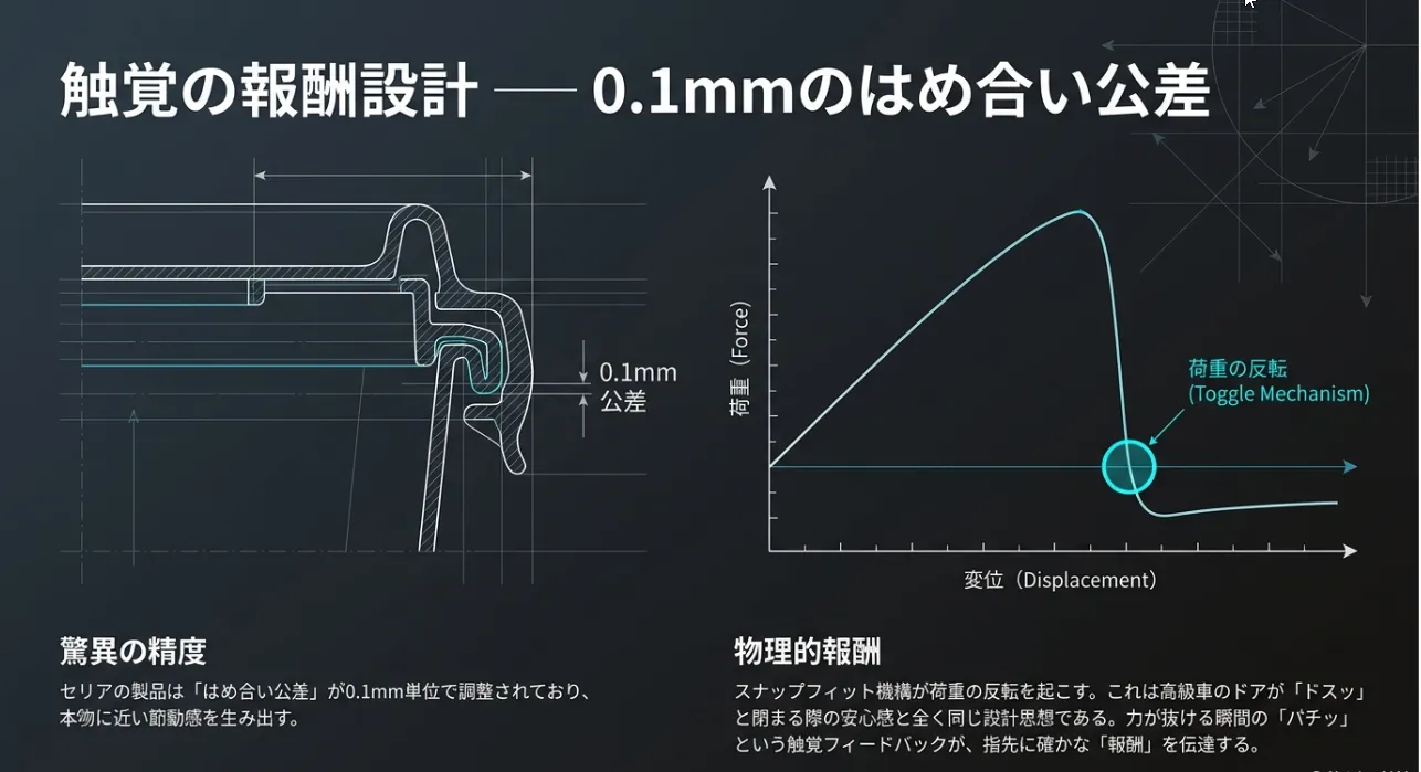 この心地よさの正体は、プラスチックの弾性を利用した「スナップフィット機構」です。蓋の凸部が容器の凹部を乗り越える際、抵抗が最大になる「死点」を越えた瞬間に荷重が解放されます。この「カチッ」という高い周波数の音と指先の感触が、ユーザーに「確実な閉止」を認識させるのです。