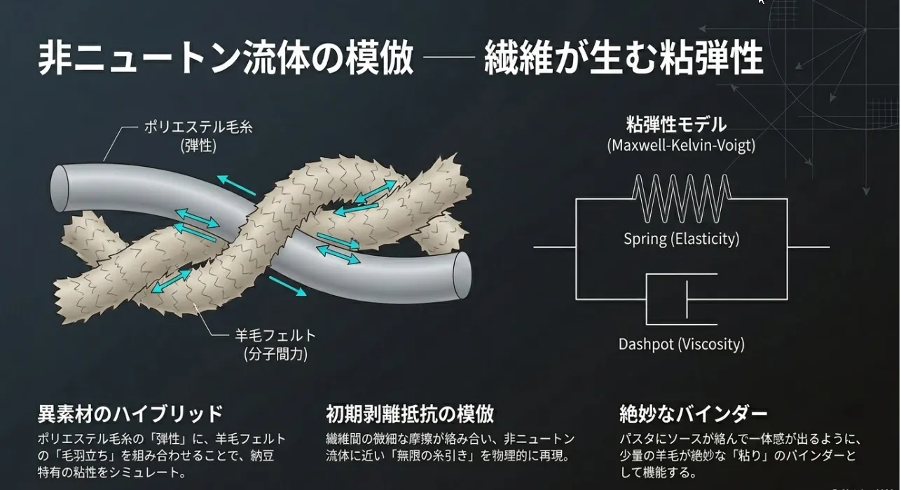 既製品に糸がない場合は、繊維の摩擦(分子間力)を利用したDIYを。ポリエステル毛糸の伸縮性が、粘弾性のある納豆の糸に近い「復元速度」を物理的に模倣します。