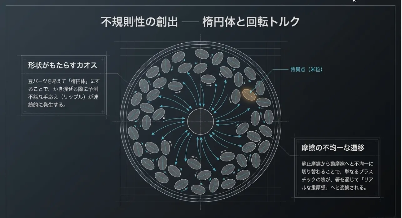 豆パーツの中に米粒やBB弾を入れ、重心をずらすことで、かき混ぜ時の手応えに不規則な振動(リップル)を創出。本物の粘り気が生む複雑な重みを再現可能です。