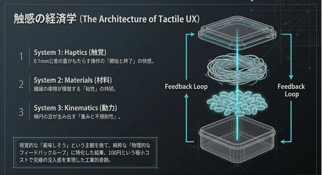 0.1mm単位の「はめ合い公差」が生むクリック感は、本物の納豆パックを閉める際のわずかな抵抗と確実な固定を再現。物理的な予測と一致する快感を提供します。