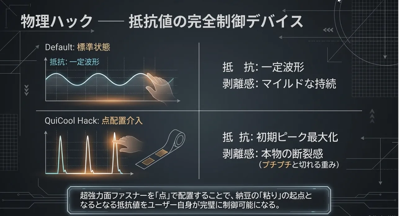| 初期抵抗のハック | マジック 両面テープ付き 超強力 | 剥離時の抵抗値が高く、納豆の「粘り」を正確にシミュレートできる。 | ★★★★★ |